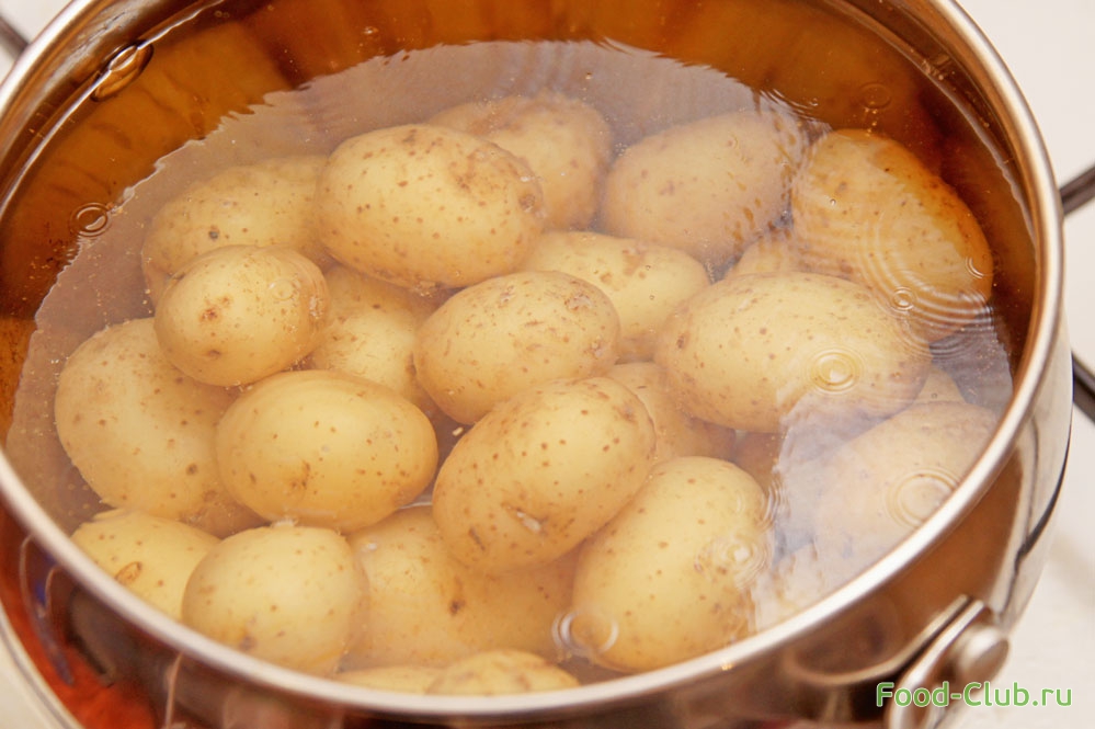 1. Картофель промойте, и если используете большие клубни, то порежьте на крупные кусочки. Забросьте (прямо в кожуре) в кипящую подсоленную воду и отварите в течении 5 минут. Отбросьте на дуршлаг и избавьтесь от лишней жидкости.